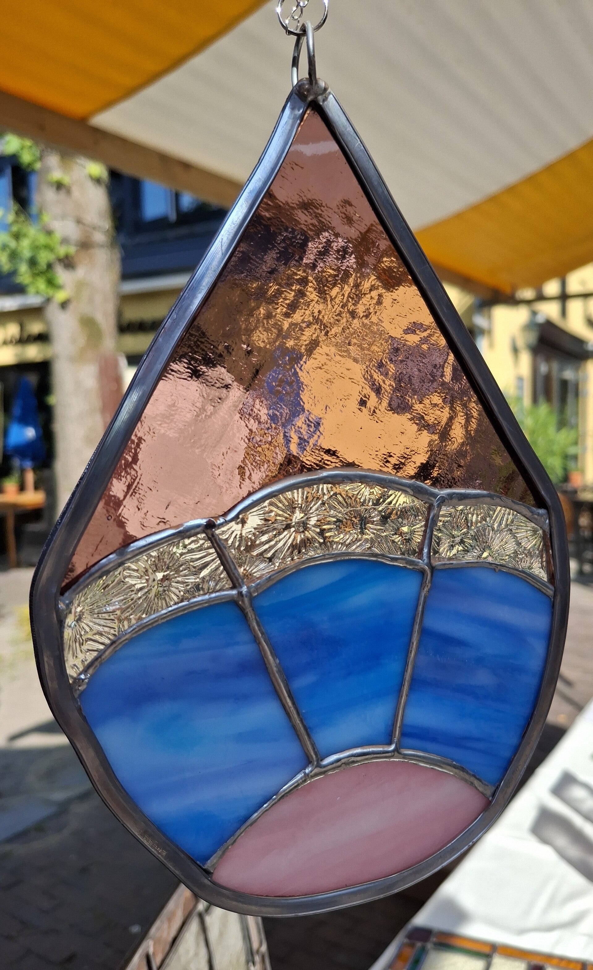 Deze hanger is met behulp van een combinatie van glas in lood en de beroemde Tiffany techniek gezet. De buitenrand van lood voor de stevigheid en de randen tussen de raampjes met behulp van Tiffany. De aangebrachte spray zorgt ervoor dat de hanger langer blijft glimmen, en jarenlang mee kan.